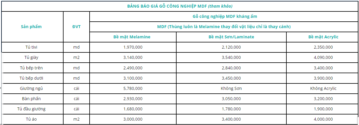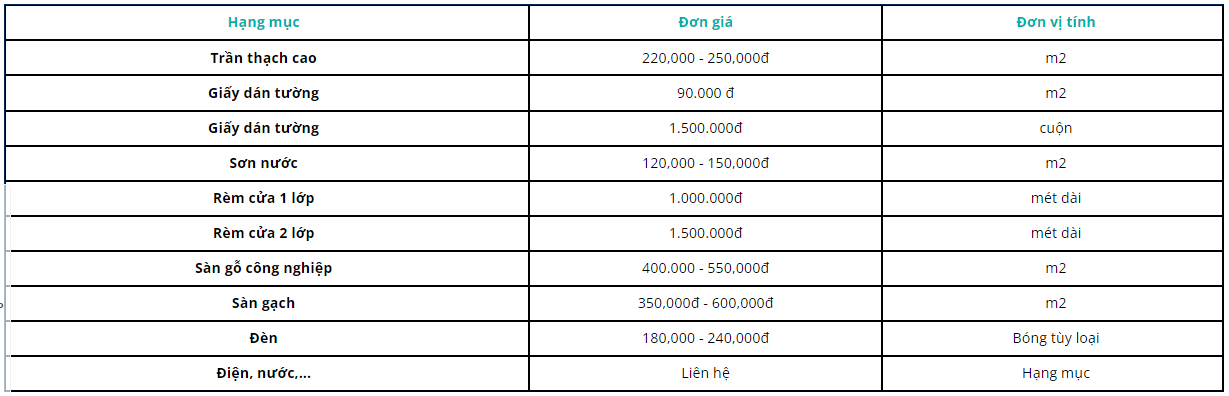*Lưu ý: Bảng giá trên chỉ mang tính chất tham khảo, và có thể có sự thay đổi tùy theo diện tích thực tế, hạng mục và phong cách  thực hiện. Bởi vậy, để biết mức giá chính xác cho công trình, bạn hãy liên hệ ngay với chúng tôi để được tư vấn chi tiết nhất.