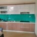 Kính cường lực ốp tường bếp và đá bàn bếp lựa chọn sử dụng gam màu theo màu chủ đạo của phòng bếp. Với đá bàn bếp sang trọng tạo điểm nhấn.