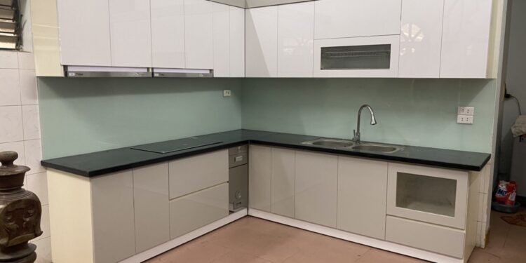 Mẫu tủ bếp acrylic nhà chú Thành được thiết kế theo dáng chữ L hợp phong thủy nhà bếp và thiết kế của phòng bếp. Thiết kế tủ bếp gồm tủ trên và tủ dưới mang đến sự tiện lợi cho người nội trợ trong quá trình chuẩn bị đồ.